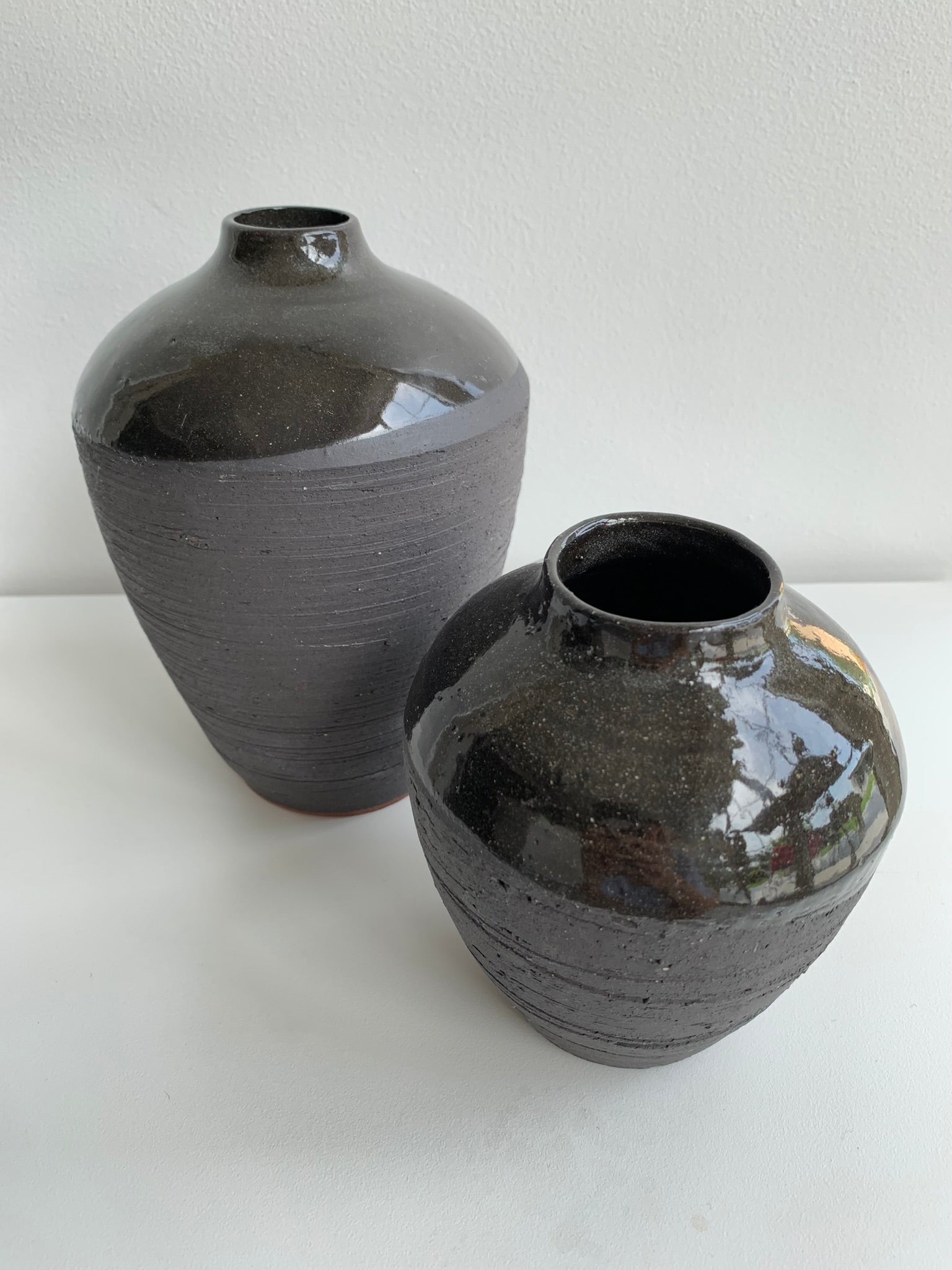 2 zwarte vazen gemaakt met chamotteklei, ruwe buitenkant.