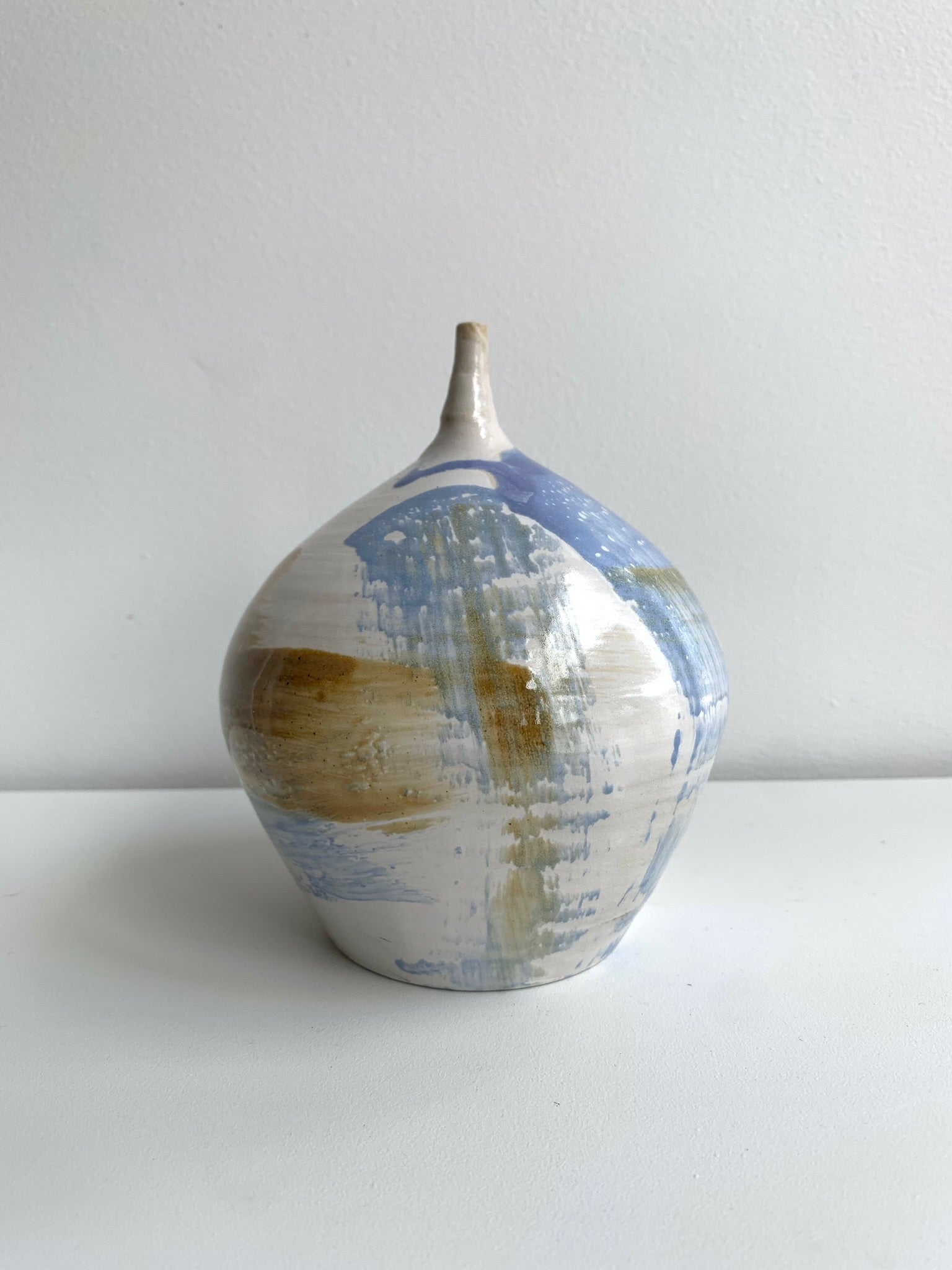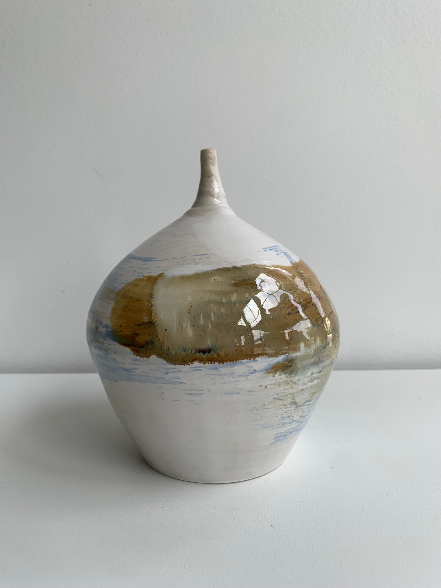Wit object, geglazuurd aan de buitenkant en afgewerkt met blauwe en bronskleurige glazuur.